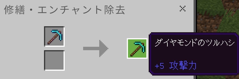 左のスロットに修繕エンチャントのついたアイテム(ここではダイヤモンドのツルハシ)をセットしてください。