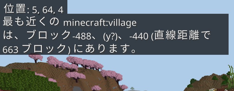 村の座標を知りたい場合は、以下のコマンドをチャット欄に入力しましょう。