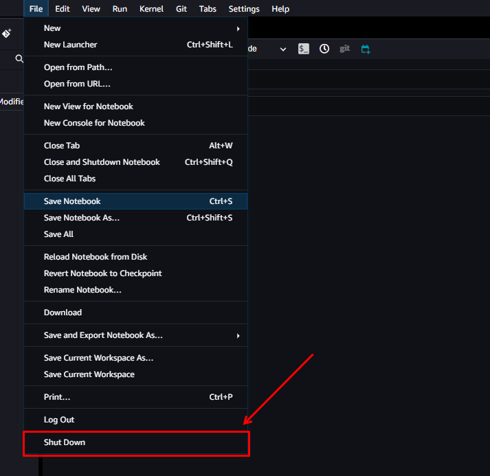 なお、SageMakerを閉じる際には、必ず図の「ShutDown」をクリックして閉じるようにしましょう。計算をさせたままPCをシャットダウンすることができるように、ブラウザを閉じただけではカーネルはシャットダウンされません。シャットダウンされないとそのまま使用料金がかかってしまうため、使用が終了して閉じたい場合は必ずカーネルのシャットダウンをしてから閉じるようにします。